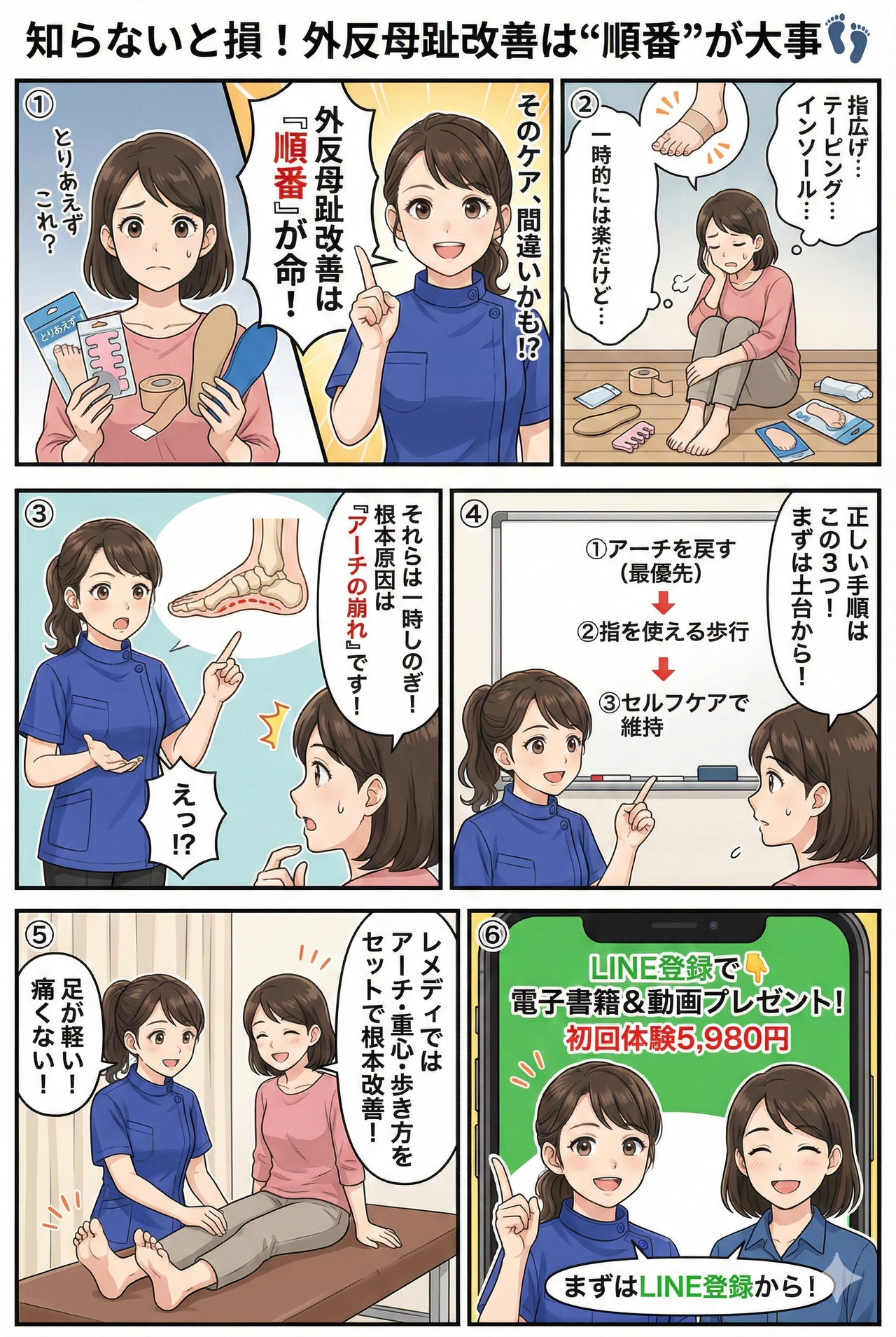 友達にも外反母趾の人がいるので、早く治療した方がいいよとアドバイスしていますが、なかなか一歩が出ないようです。私の経験上、1日も早くレメディさんに来院される様におすすめしています。