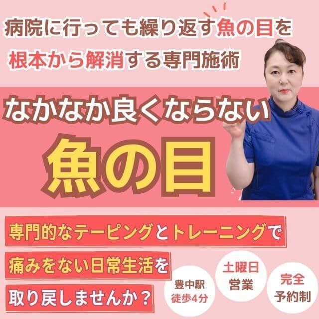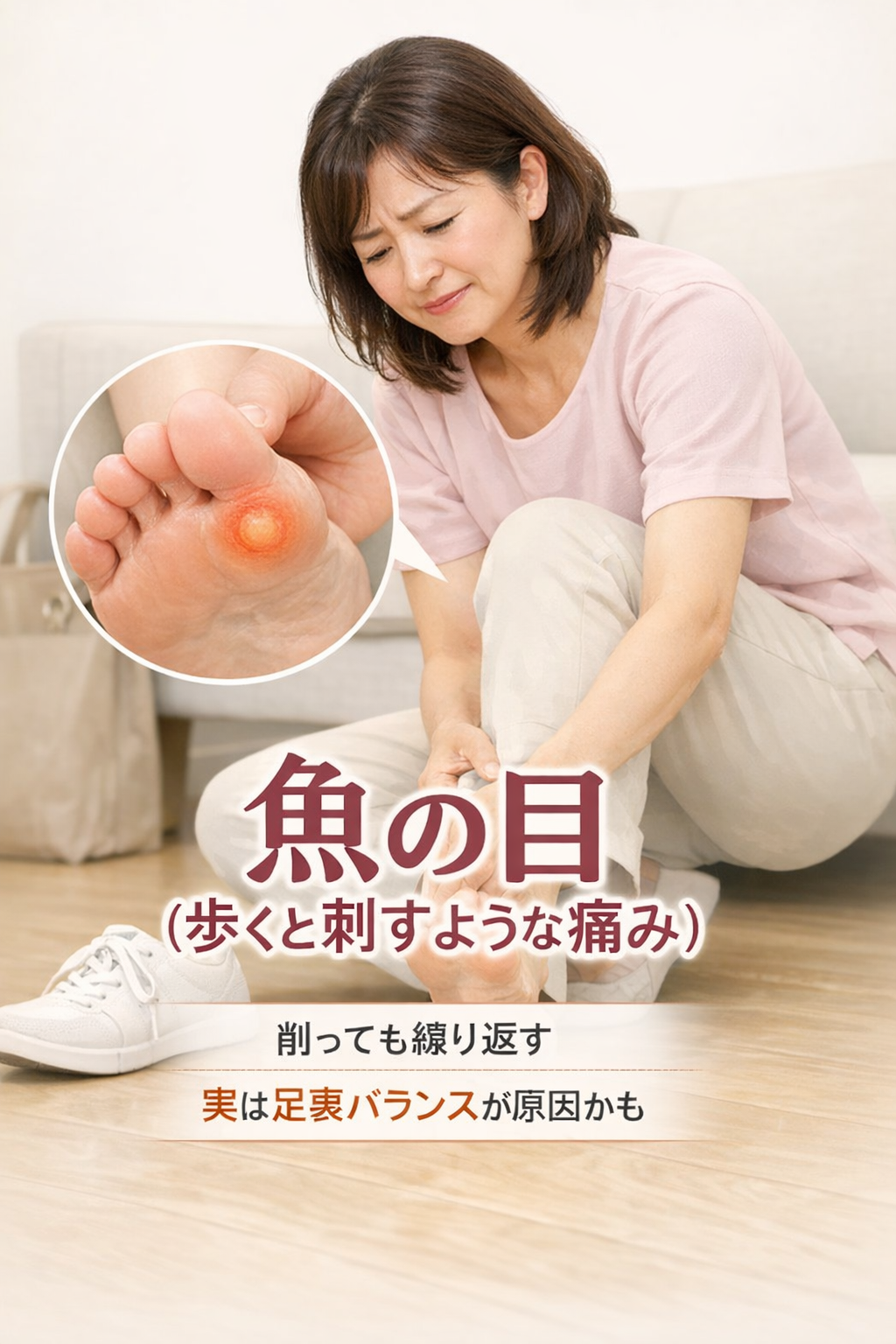 魚の目があるのは、その場所が当たりすぎているからです。足裏のバランスを整えない限り、削っても繰り返します。